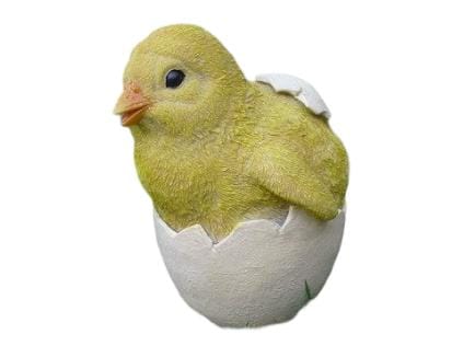 A unique garden décor item of a chick out of its shell with life-like features. This resin animal is a must-have in any garden.
