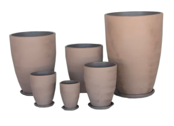 Painted terracotta pots in different texture finish with drainage saucers available in varying sizes.